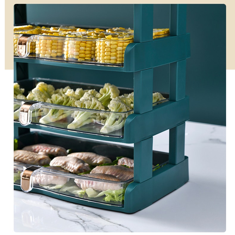 الرف أيضًا سهل الاستخدام. ما عليك سوى وضع خضارك على الرفوف وتراصها فوق بعضها البعض. الرفوف مهواة، لذا ستبقى خضارك طازجة ومقرمشة.