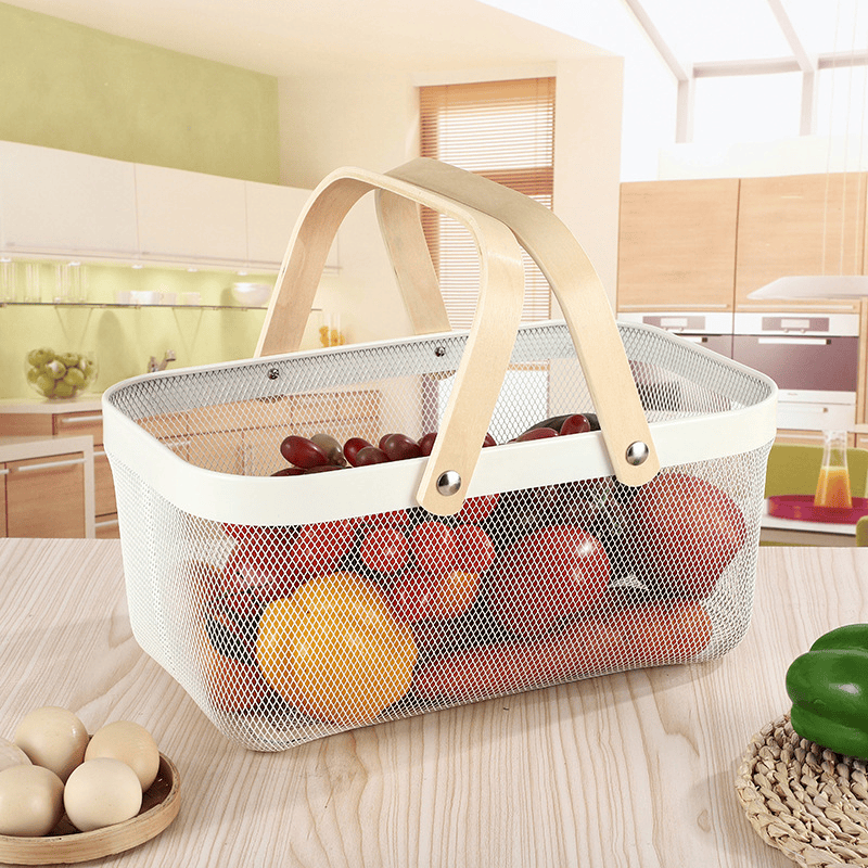 20.00 QARRectangle Iron Mesh Storage Basket with Wooden Handle 40*24.5*19cm
