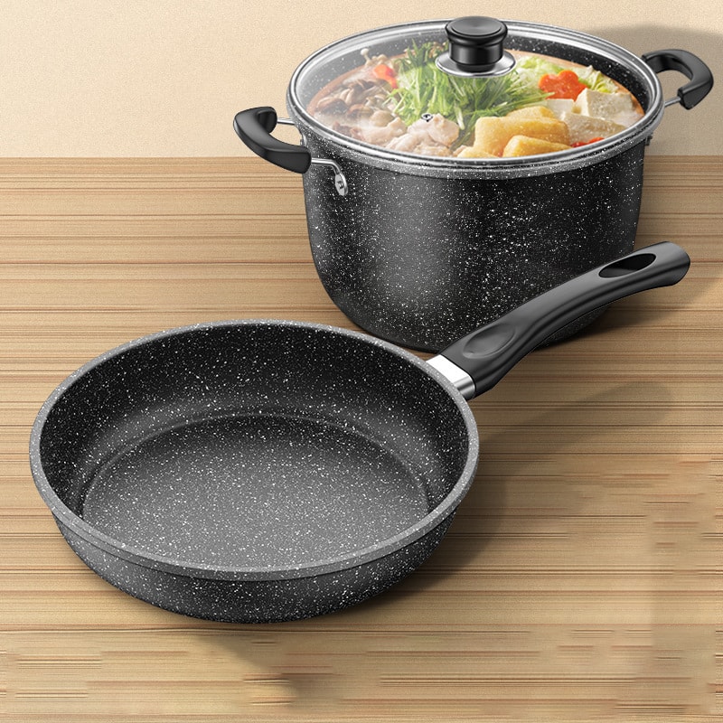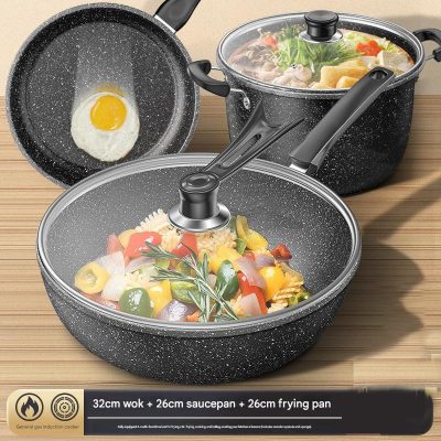 This cookware set includes a 32 cm wok with lid, a 26 cm stock pot with lid, and a 26 cm frying pan. Made from strong wrought iron with a safe water-based coating, the set provides even heating and long-lasting durability. The non-stick interior makes cooking easier and allows for effortless cleaning. This set is ideal for daily cooking, frying, boiling, and stir-frying.