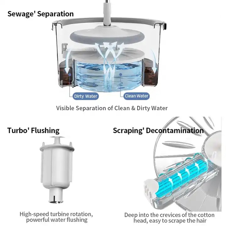 **Unique Self-Separation Design:** Our rotating mop bucket supports the self-separation of sewage and purified water. You can clean the mop at any time with clean water from the bucket, and the integrated drain makes water disposal a breeze.