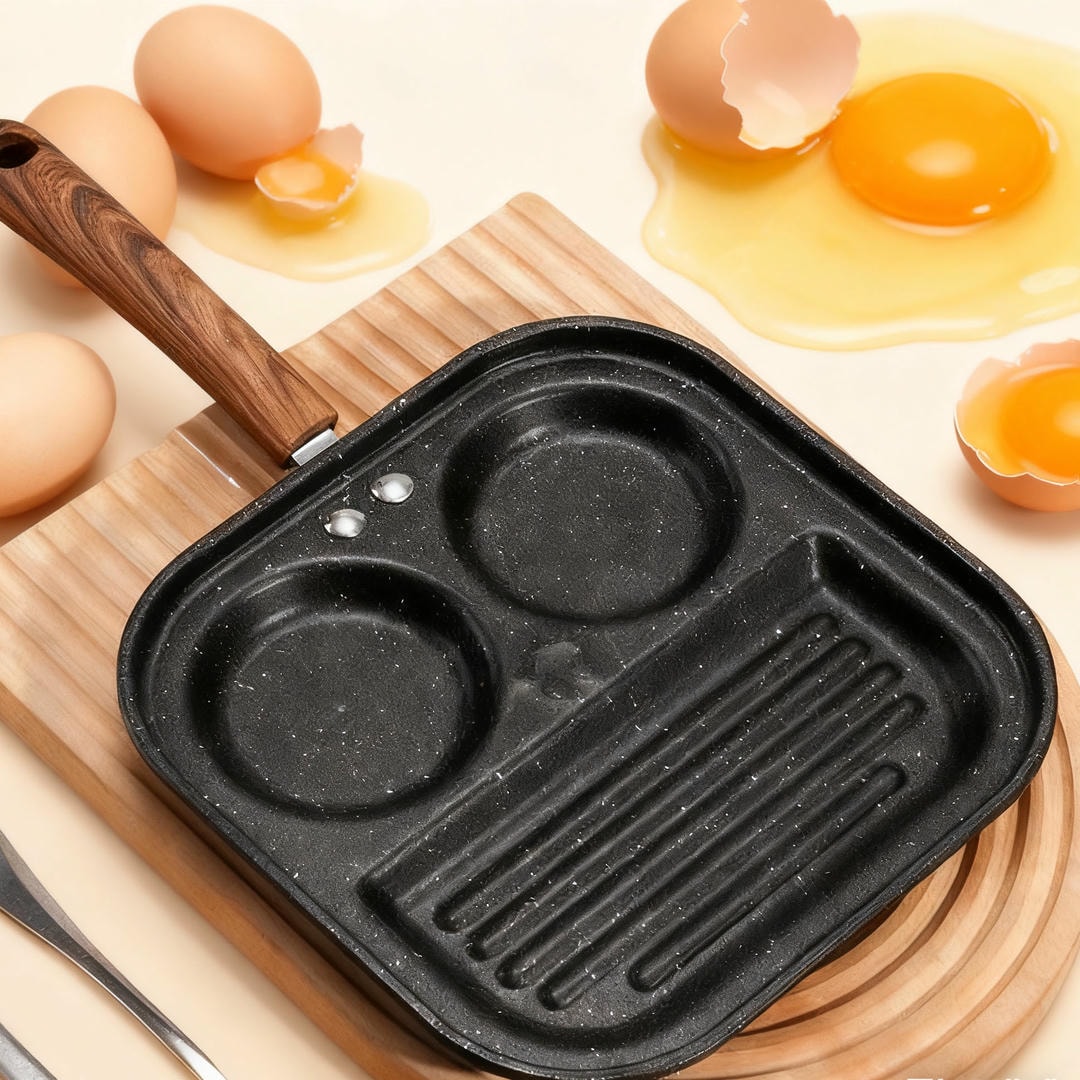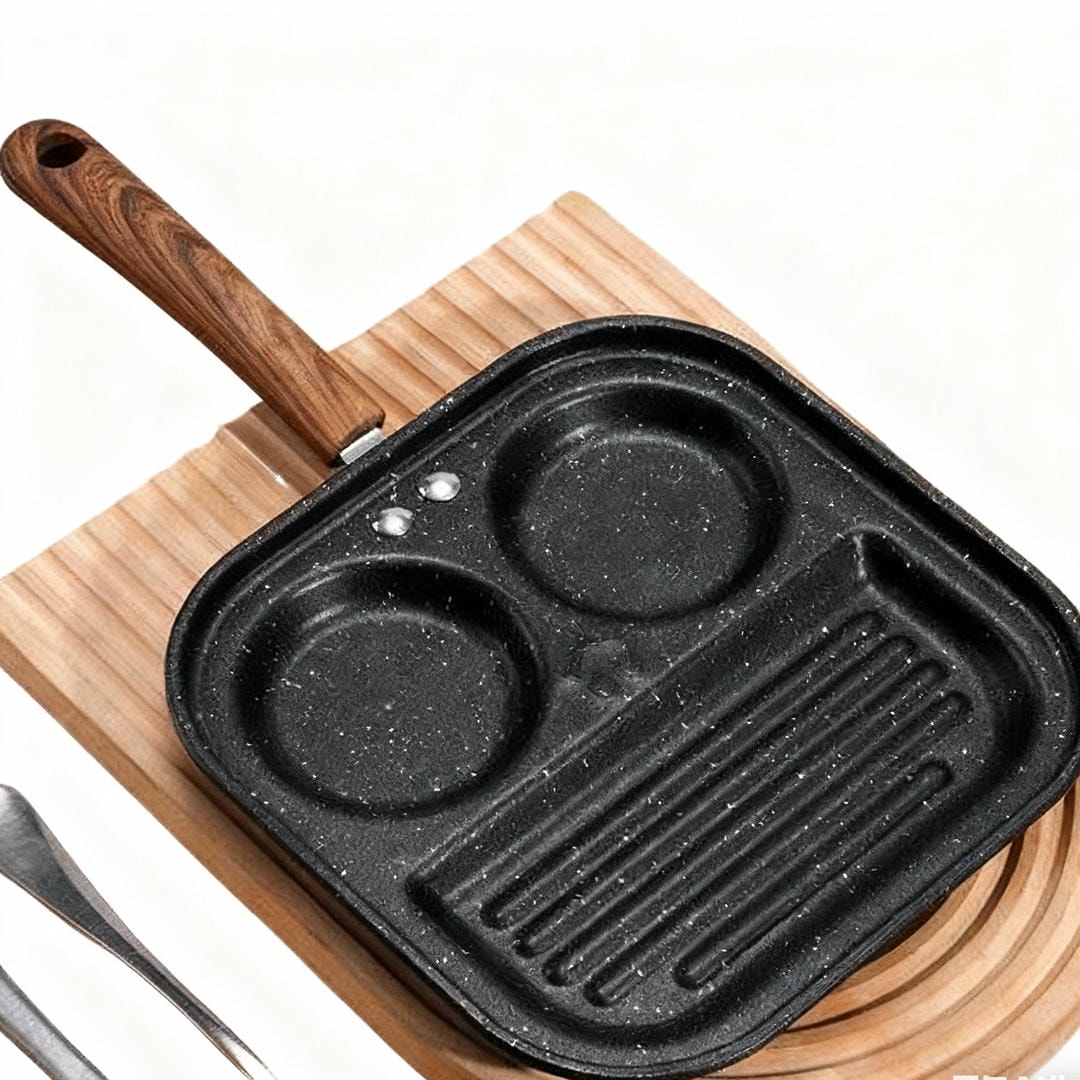 This three-hole steak pan is made from durable iron with a non-stick coating and a heat-resistant Bakelite handle. Designed for universal use, it features three cooking sections?perfect for steak, eggs, pancakes, and side dishes at the same time. The size is 37.8 ? 21.4 ? 2 cm, offering fast heating and easy cleaning.