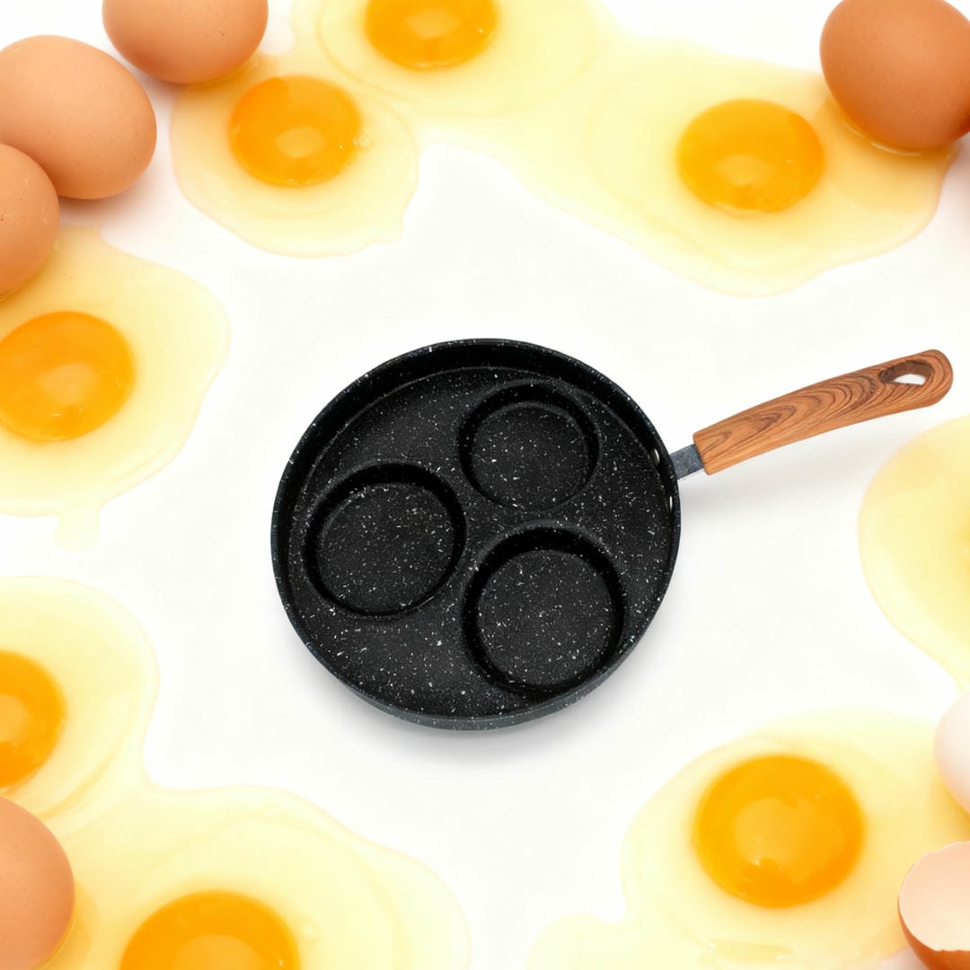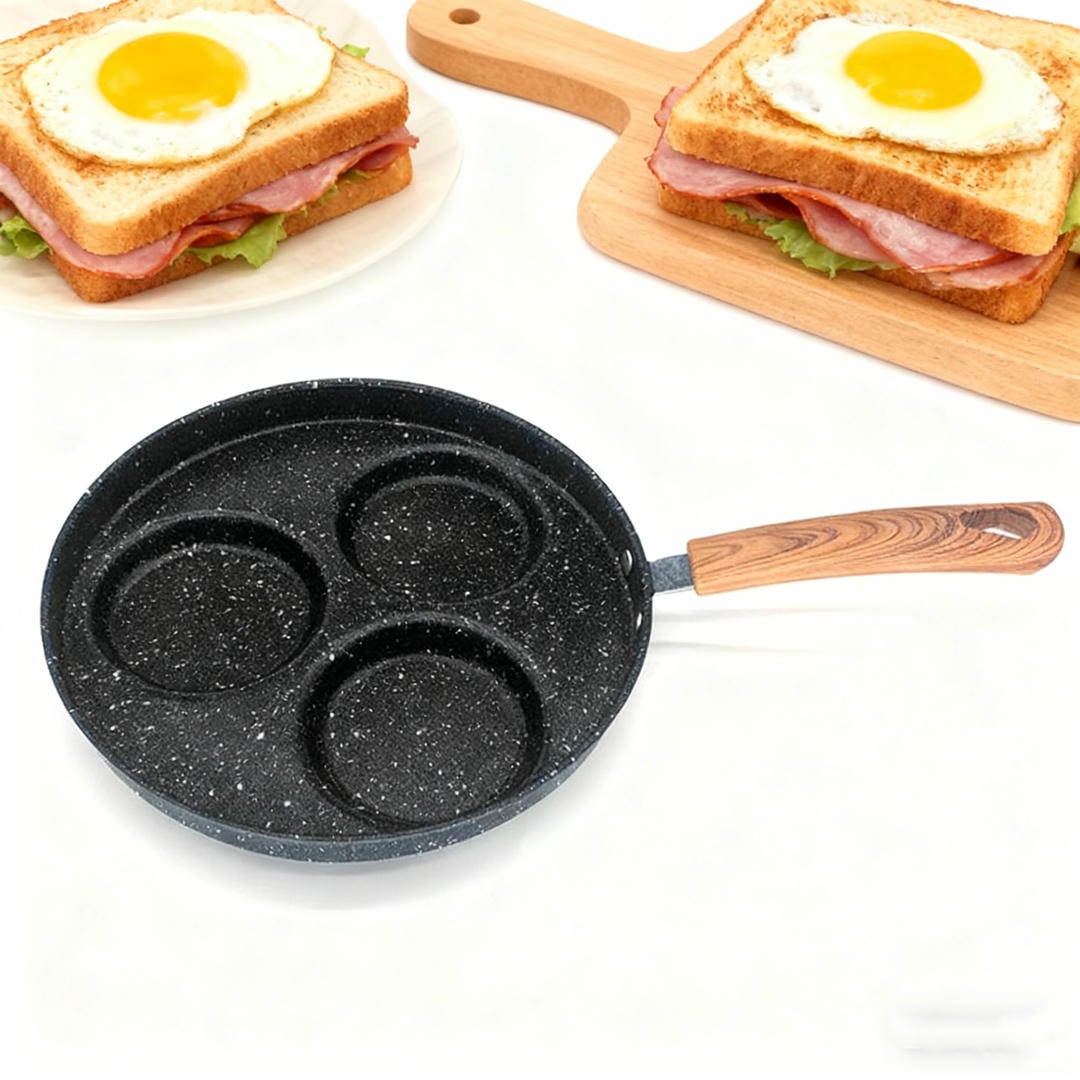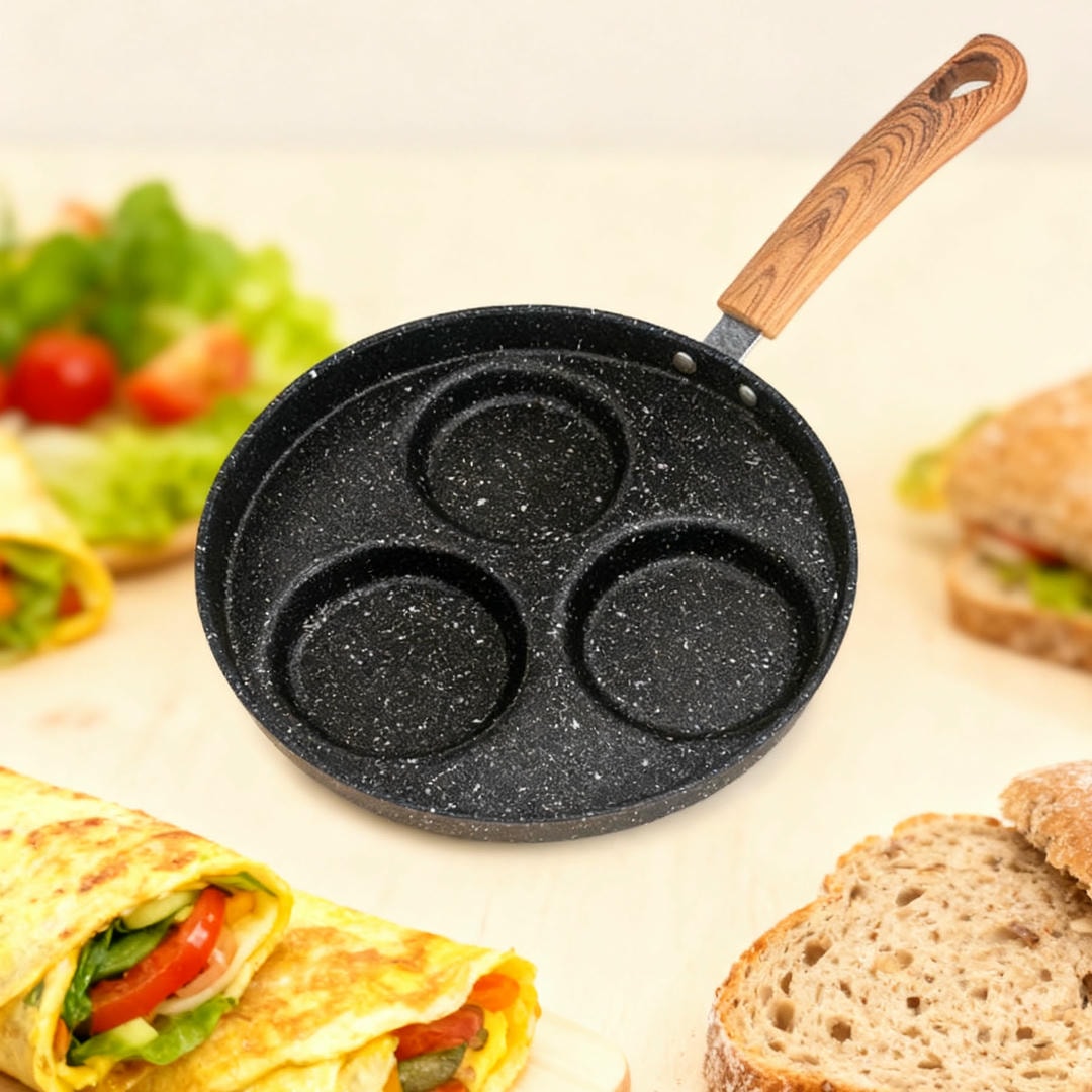 This iron 3-hole frying pan is designed for universal kitchen use and features a durable iron body with a non-stick coating. The heat-resistant Bakelite handle ensures safe and comfortable cooking. The pan measures 39.3 ? 22.3 ? 3.5 cm and includes three round sections, ideal for cooking eggs, pancakes, mini burgers, and snacks at the same time.