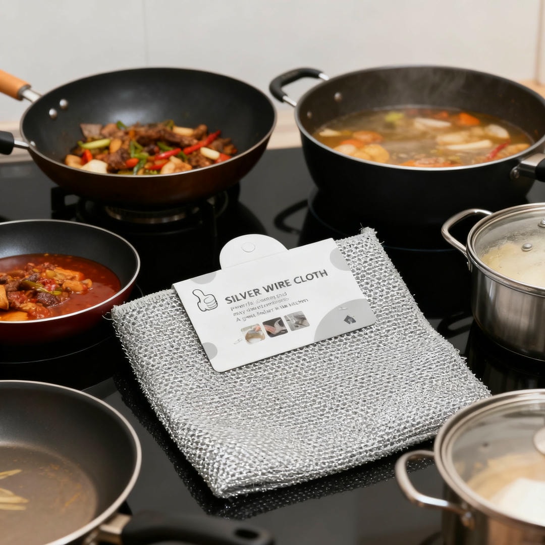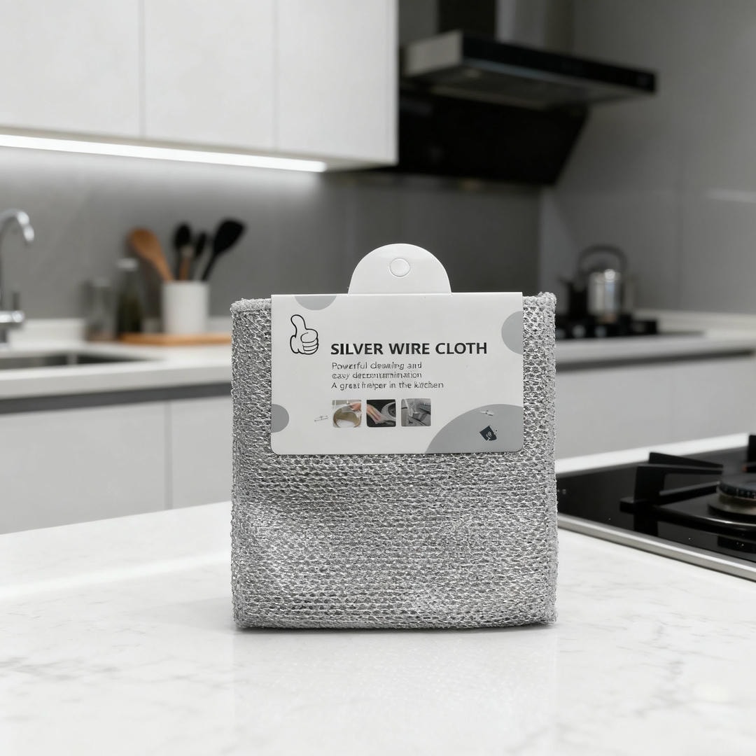 This silver wire cloth set is designed for strong and effective cleaning of kitchen surfaces, dishes, and stainless-steel items. Each cloth is made from polyester silver-thread fabric that provides good scrubbing power while staying gentle on surfaces. The pack includes 5 double-layer cloths, each with a size of 20 ? 20 cm, making them durable and easy to use for daily cleaning.